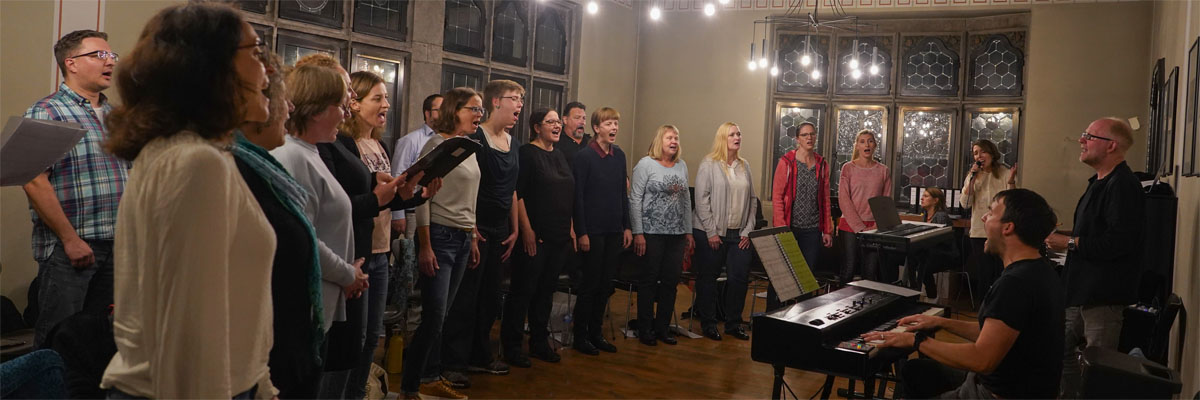 Wir sind ein 40-köpfiges Ensemble aus Chorsängern, Solisten und Band.