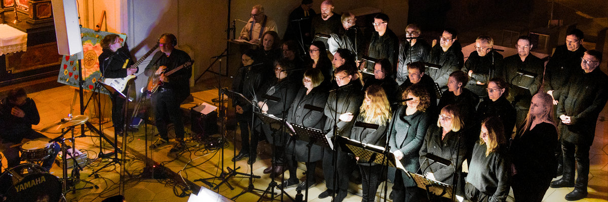 Wir sind ein 40-köpfiges Ensemble aus Chorsängern, Solisten und Band.